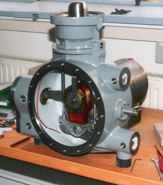 Winkelgetriiebe von der Verdrängerkolben-Welle angetrieben wird (rot